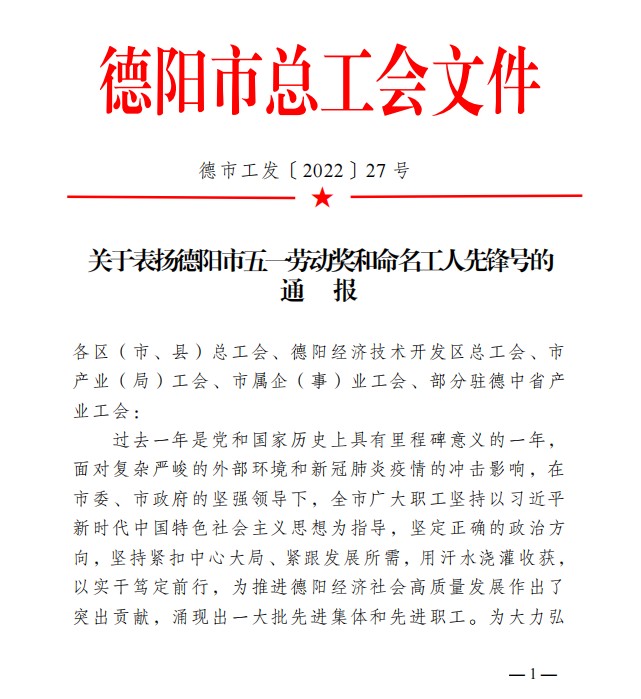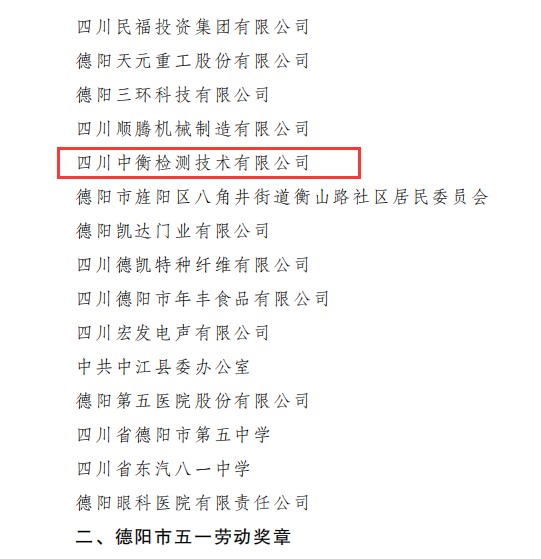 在4月27日德陽市總工會文件中,四川中衡檢測技術(shù)有限公司在《關(guān)于表揚德陽市五一勞動獎和命名工人先鋒號的通報》里,受到了“德陽市五一勞動獎狀”的表彰。