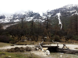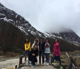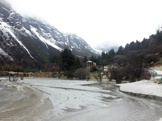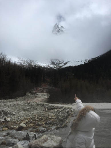 從景區(qū)門(mén)口到第一個(gè)景點(diǎn)相距20多公里,共33個(gè)急彎道,乘坐觀光大巴上去,司機(jī)大叔的車(chē)技了得,被我們戲稱(chēng)為“秋名山車(chē)神”??墒潜M管“車(chē)神”車(chē)技了得,那33道急彎的威力依然不容小覷,毫無(wú)懸念的,我們的小伙伴部分暈車(chē)了。所幸,不嚴(yán)重。下車(chē),到達(dá)景區(qū),看到大雪山的那一刻便激動(dòng)了,于是開(kāi)啟了我們拍拍拍的模式,一路走一路拍,上山的路上飄著小雪。