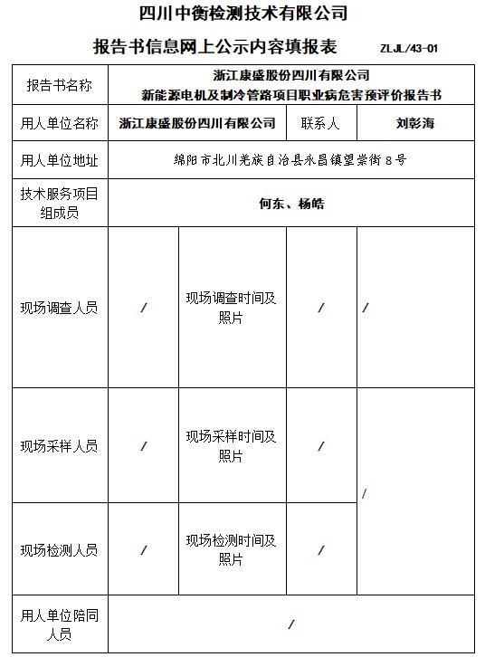 浙江康盛股份四川有限公司 新能源電機及制冷管路項目職業(yè)病危害預(yù)評價報告書