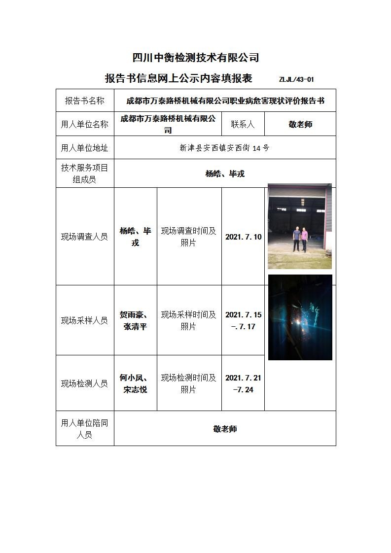 成都市萬泰路橋機(jī)械有限公司職業(yè)病危害現(xiàn)狀評價報告書