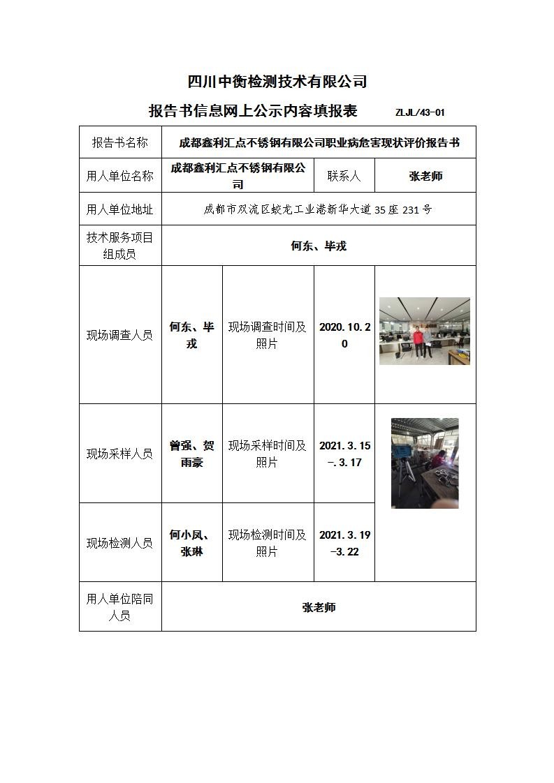 成都鑫利匯點不銹鋼有限公司職業(yè)病危害現(xiàn)狀評價報告書