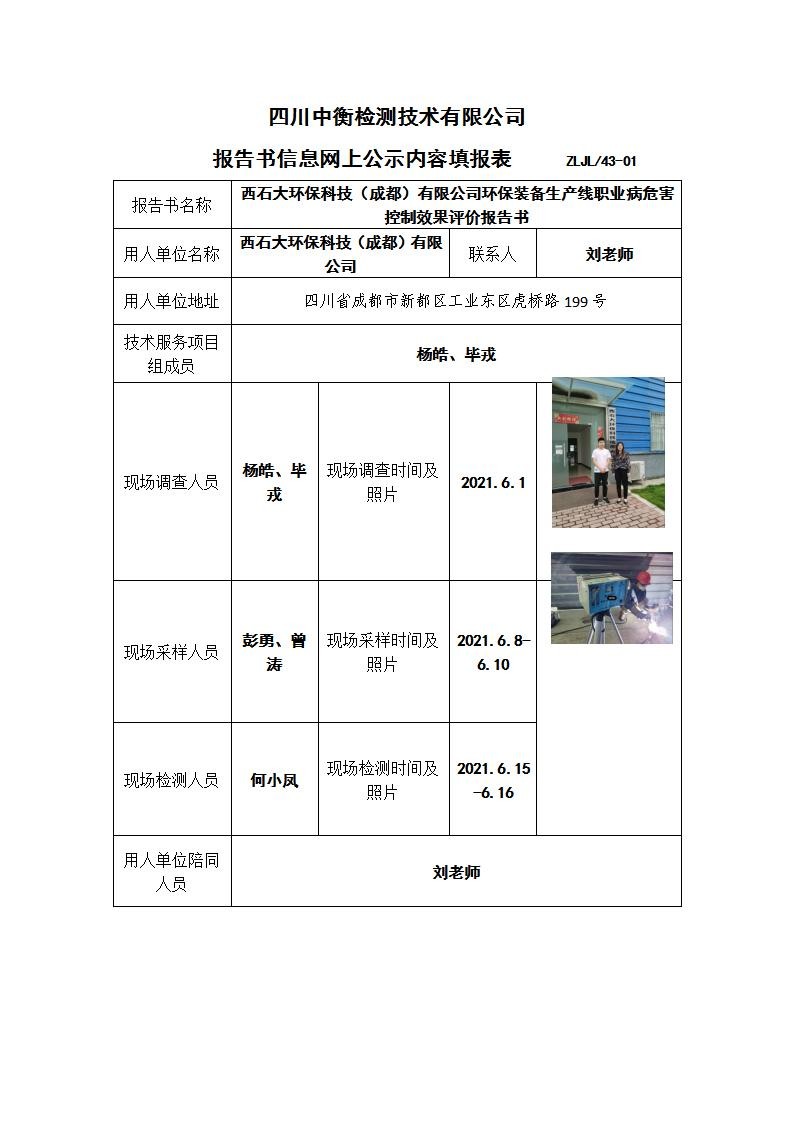 西石大環(huán)保科技(成都)有限公司環(huán)保裝備生產(chǎn)線職業(yè)病危害控制效果評(píng)價(jià)報(bào)告書