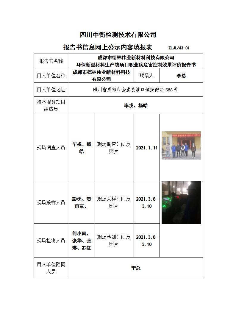 成都市德林偉業(yè)新材料科技有限公司 環(huán)保新型材料生產(chǎn)線項目職業(yè)病危害控制效果評價