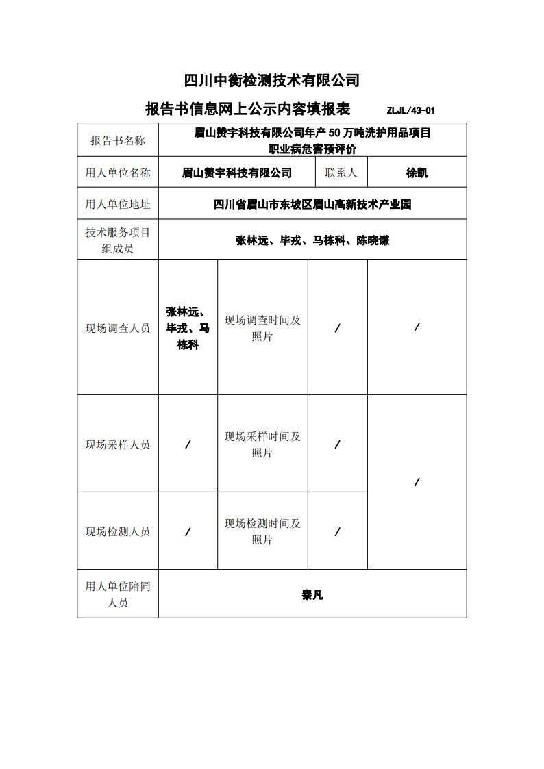 眉山贊宇科技有限公司年產(chǎn)50萬噸洗護(hù)用品項(xiàng)目職業(yè)病危害預(yù)評價(jià)