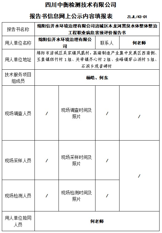 綿陽信開水環(huán)境治理有限公司涪城區(qū)木龍河黑臭水體整體整治工程職業(yè)病危害預(yù)評價