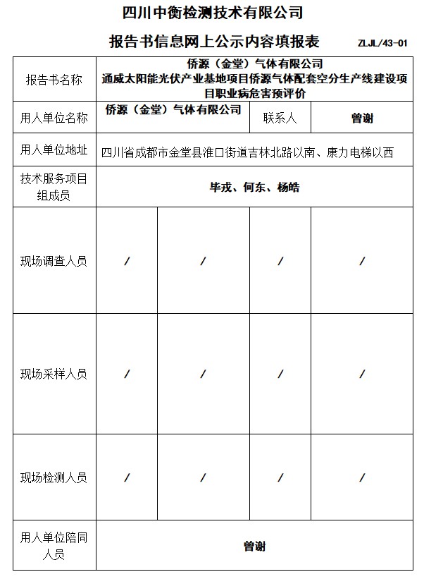 僑源(金堂)氣體有限公司 通威太陽(yáng)能光伏產(chǎn)業(yè)基地項(xiàng)目?jī)S源氣體配套空分生產(chǎn)線建設(shè)項(xiàng)目職業(yè)病危害預(yù)評(píng)價(jià)