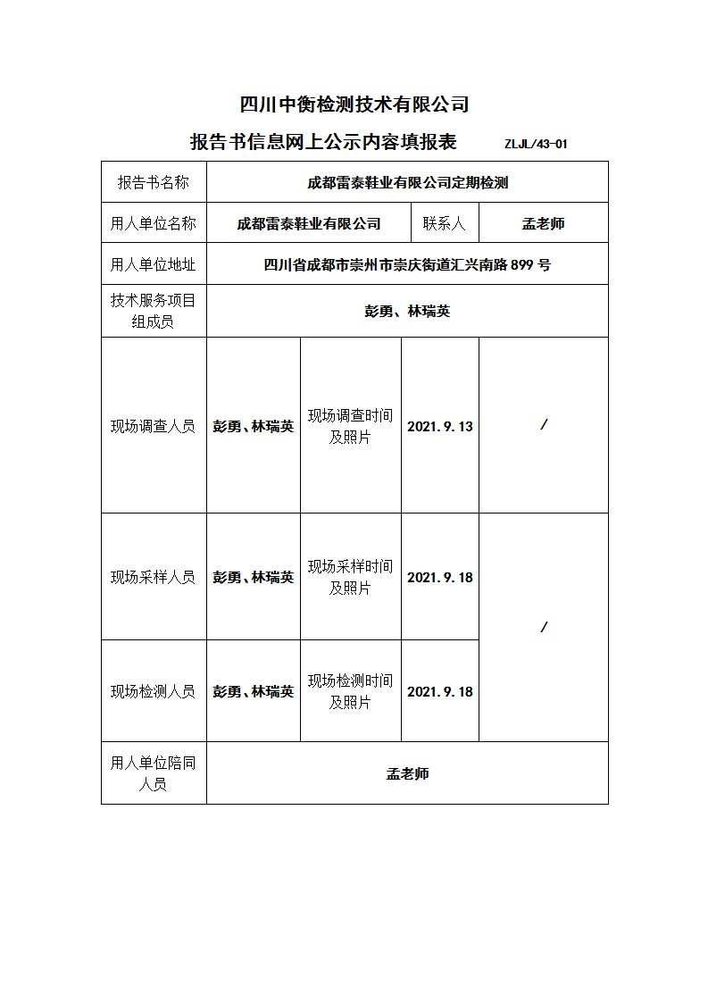 成都雷泰鞋業(yè)有限公司職業(yè)病危害定期檢測