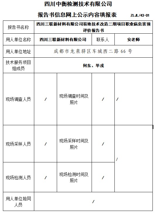 四川三聯(lián)新材料有限公司易地技術(shù)改造二期項(xiàng)目職業(yè)病危害預(yù)評(píng)價(jià)