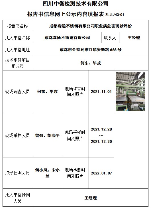 成都森通不銹鋼有限公司職業(yè)病危害現(xiàn)狀評價(jià)