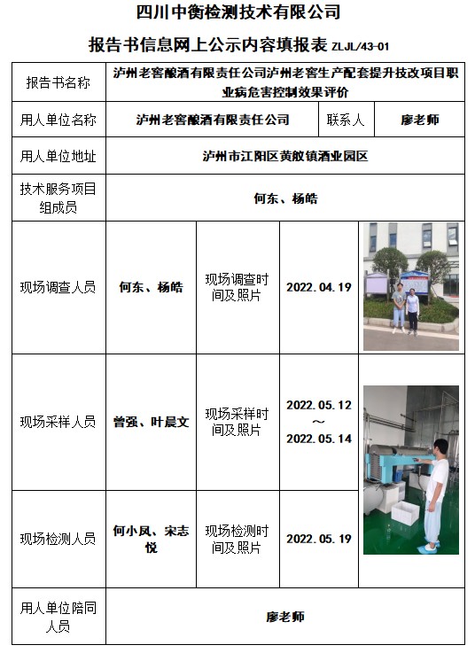 瀘州老窖釀酒有限責(zé)任公司瀘州老窖生產(chǎn)配套提升技改項(xiàng)目職業(yè)病危害控制效果評(píng)價(jià)