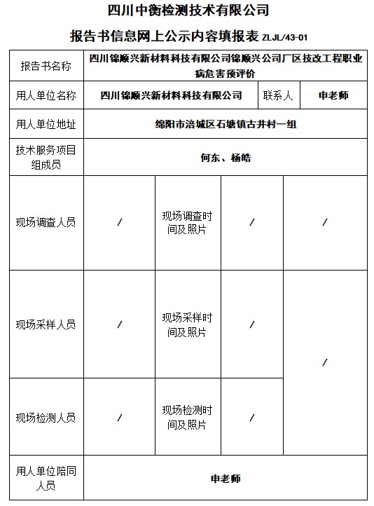 四川錦順興新材料科技有限公司錦順興公司廠區(qū)技改工程職業(yè)病危害預評價