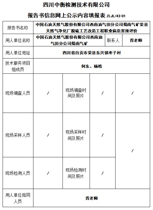中國石油天然氣股份有限公司西南油氣田分公司蜀南氣礦榮縣天然氣凈化廠脫硫工藝改造工程職業(yè)病危害預(yù)評(píng)價(jià)