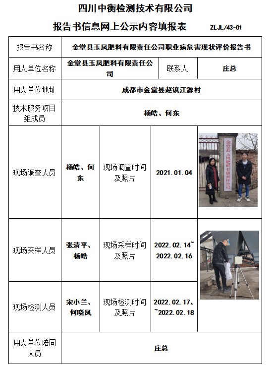 金堂縣玉鳳肥料有限責(zé)任公司職業(yè)病危害現(xiàn)狀評價(jià)