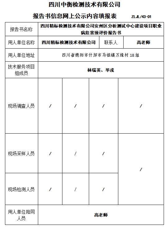 四川精標(biāo)檢測技術(shù)有限公司安州區(qū)分析測試中心建設(shè)項(xiàng)目職業(yè)病危害預(yù)評價(jià)