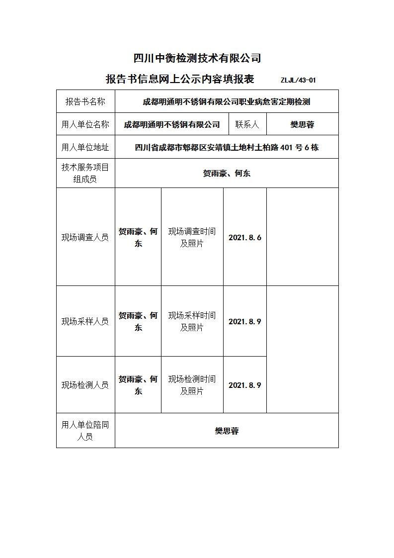 成都明通明不銹鋼有限公司職業(yè)病危害定期檢測(cè)