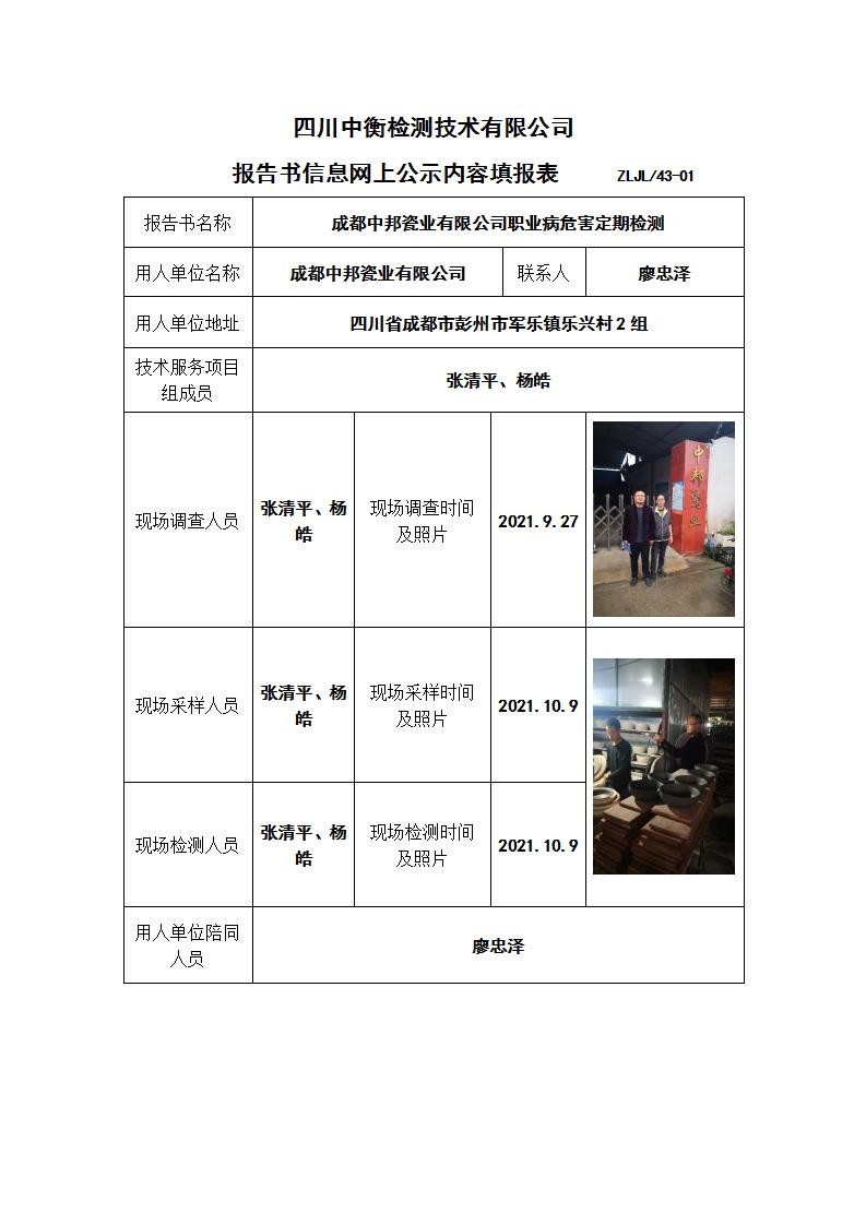 成都中邦瓷業(yè)有限公司職業(yè)病危害定期檢測