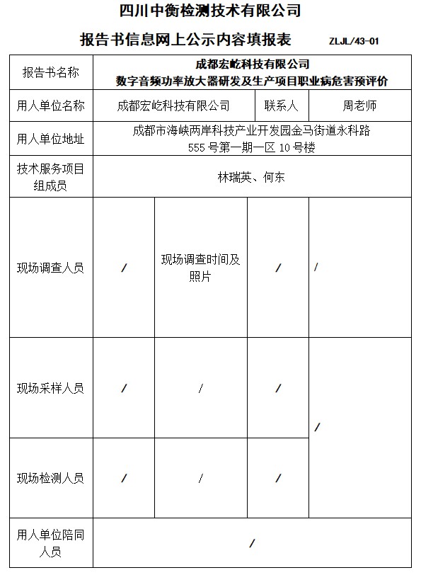 成都宏屹科技有限公司 數(shù)字音頻功率放大器研發(fā)及生產(chǎn)項(xiàng)目職業(yè)病危害預(yù)評(píng)價(jià)