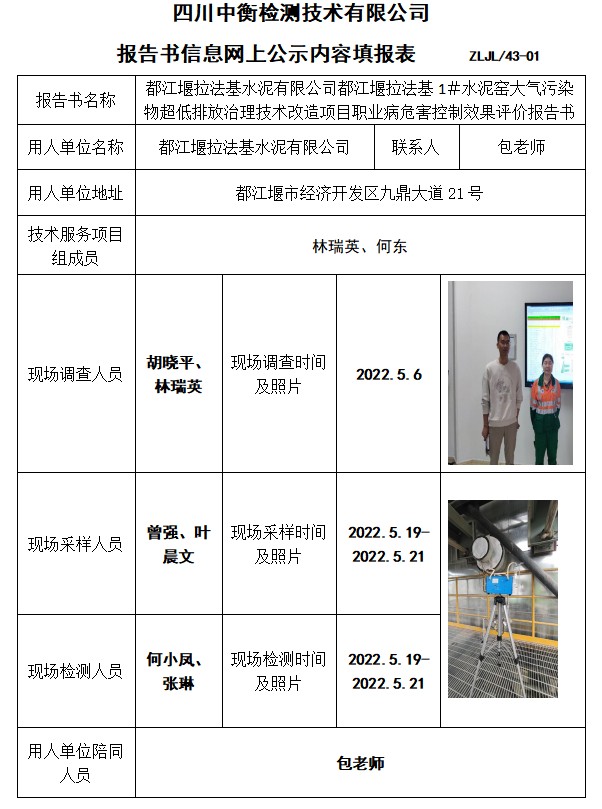 都江堰拉法基水泥有限公司都江堰拉法基1#水泥窯大氣污染物超低排放治理技術(shù)改造項(xiàng)目職業(yè)病危害控制效果評價(jià)