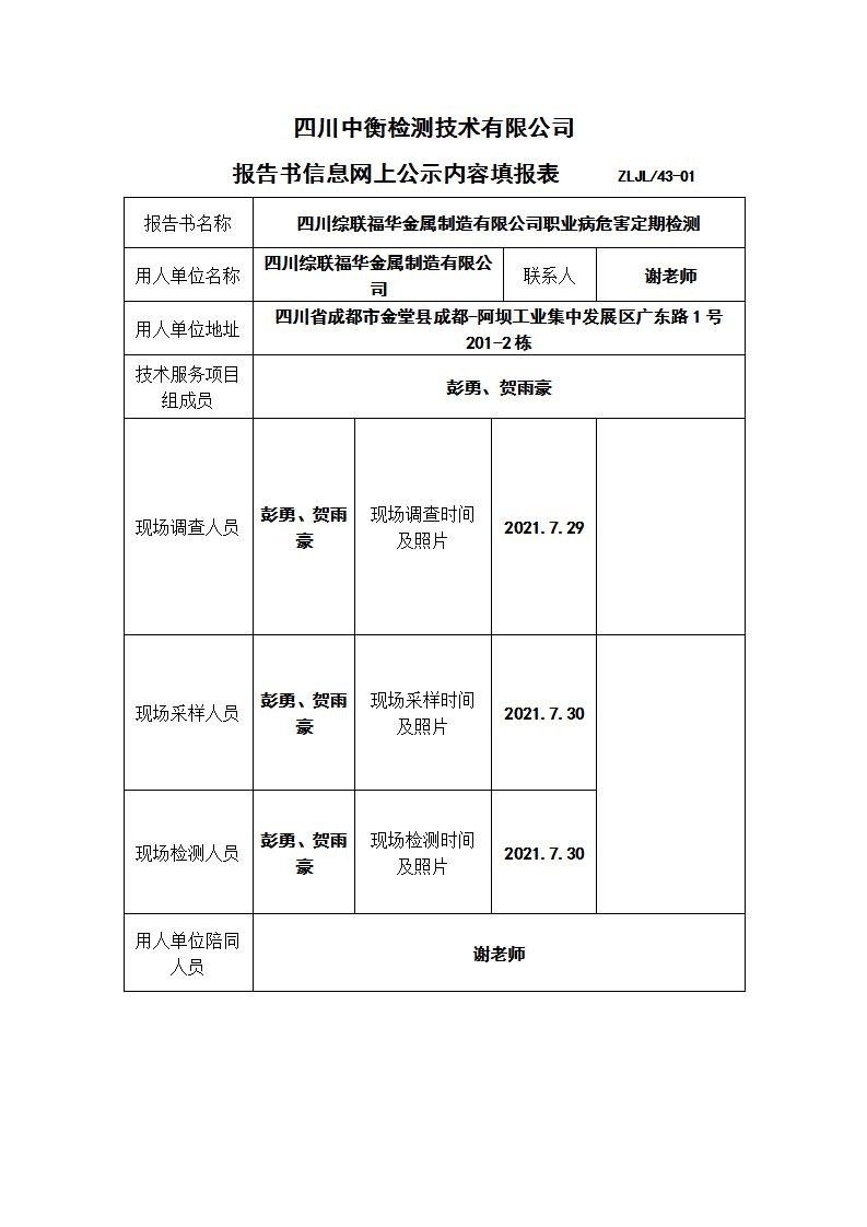四川綜聯(lián)福華金屬制造有限公司職業(yè)病危害定期檢測