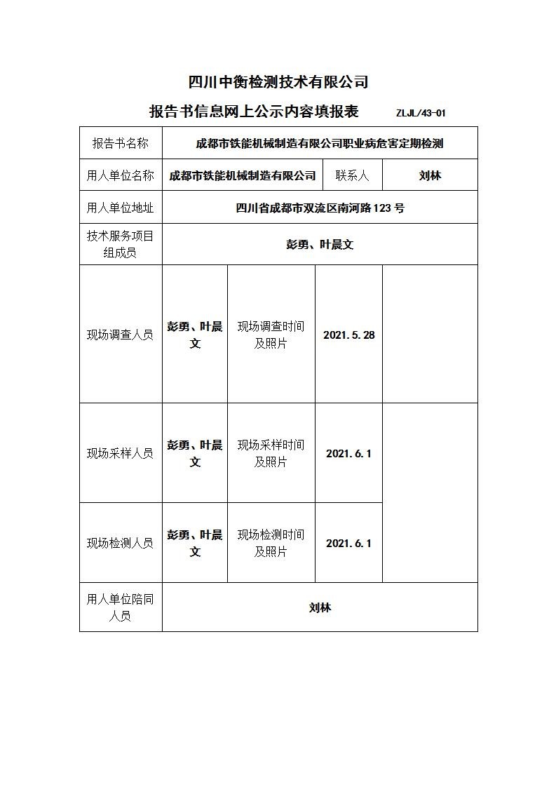 成都市鐵能機(jī)械制造有限公司職業(yè)病危害定期檢測(cè)