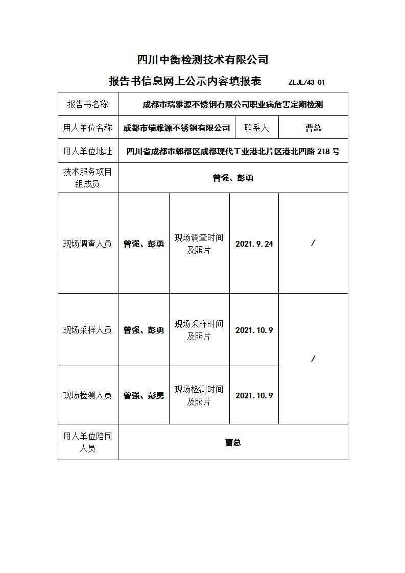 成都市瑞雅源不銹鋼有限公司職業(yè)病危害定期檢測(cè)