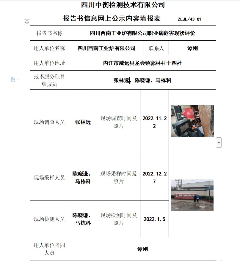 四川西南工業(yè)爐有限公司職業(yè)病危害現(xiàn)狀評價