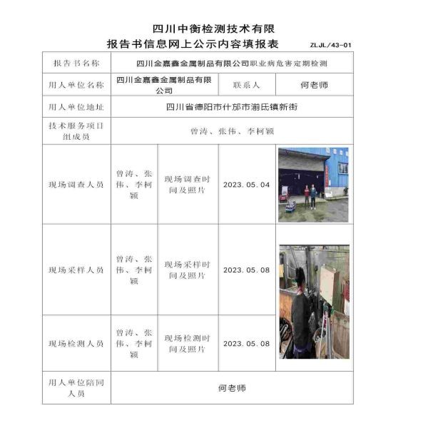 四川金嘉鑫金屬制品有限公司職業(yè)病危害定期檢測