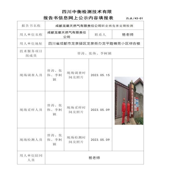 成都龍星天然氣有限責(zé)任公司職業(yè)病危害定期檢測(cè)