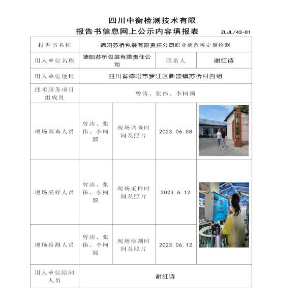 德陽蘇橋包裝有限責(zé)任公司職業(yè)病危害定期檢測