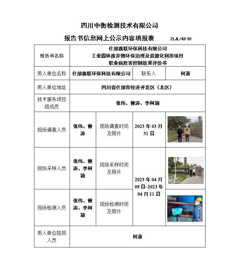 什邡鑫聯(lián)環(huán)??萍加邢薰?工業(yè)固體廢棄物環(huán)保治理及資源化利用項(xiàng)目 職業(yè)病危害控制效果評價(jià)