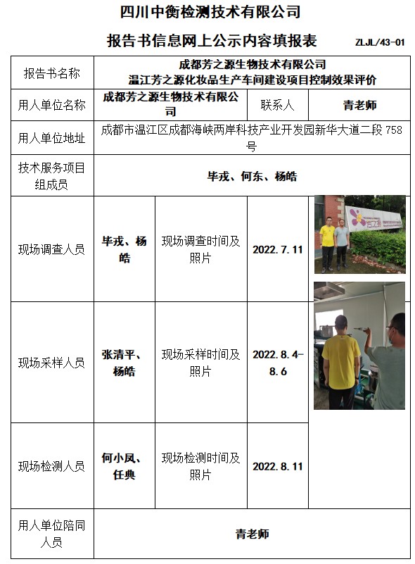 成都芳之源生物技術(shù)有限公司 溫江芳之源化妝品生產(chǎn)車間建設(shè)項目控制效果評價