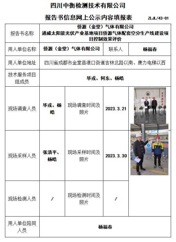 僑源(金堂)氣體有限公司 通威太陽能光伏產(chǎn)業(yè)基地項目僑源氣體配套空分生產(chǎn)線建設(shè)項目控制效果評價