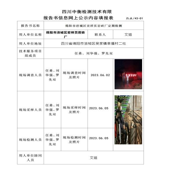 綿陽市涪城區(qū)宏祥頁巖磚廠定期檢測