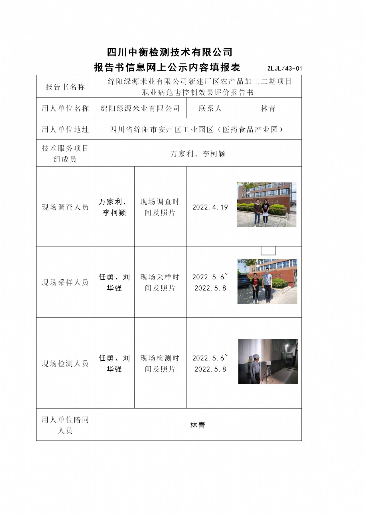 綿陽綠源米業(yè)有限公司新建廠區(qū)農(nóng)產(chǎn)品加工二期項(xiàng)目 職業(yè)病危害控制效果評價