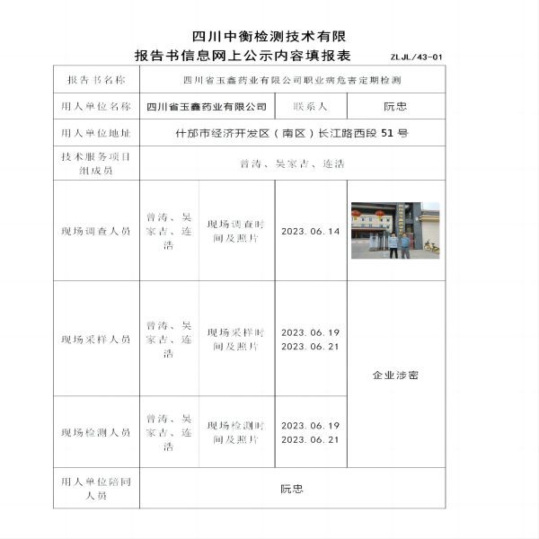 四川省玉鑫藥業(yè)有限公司定期檢測(cè)