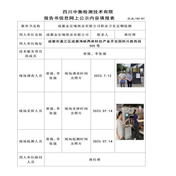 成都金宏瑞紙業(yè)有限公司定期檢測