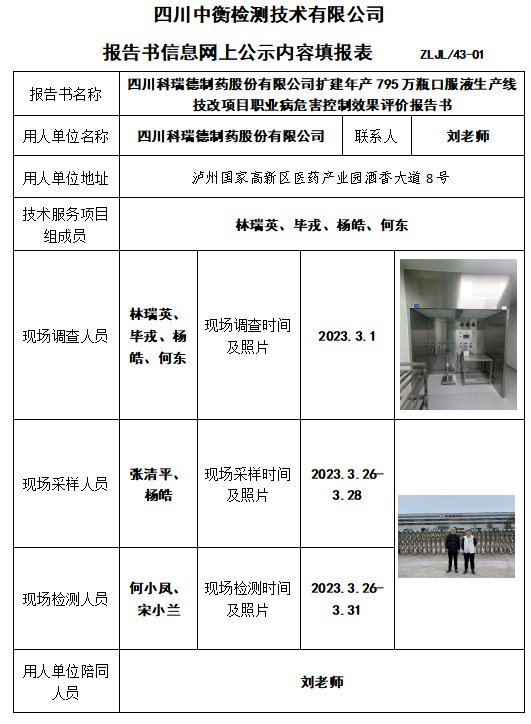 四川科瑞德制藥股份有限公司擴(kuò)建年產(chǎn)795萬瓶口服液生產(chǎn)線技改項(xiàng)目職業(yè)病危害控制效果評(píng)價(jià)報(bào)告書