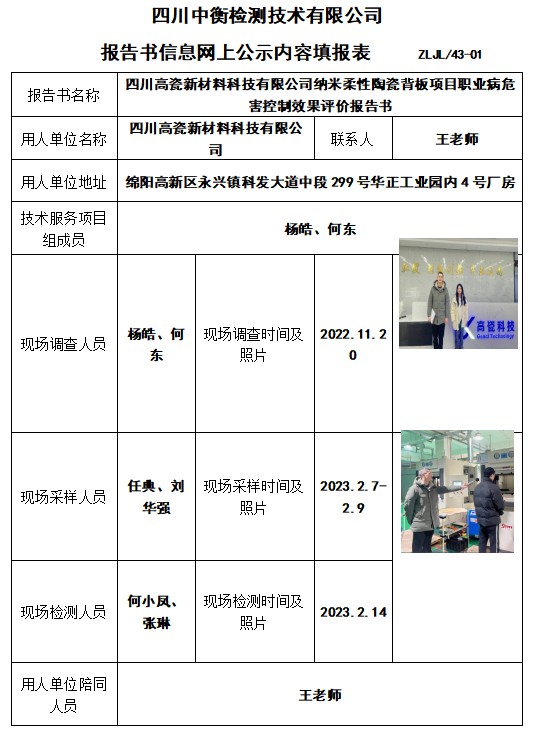 四川高瓷新材料科技有限公司納米柔性陶瓷背板項目職業(yè)病危害控制效果評價報告書