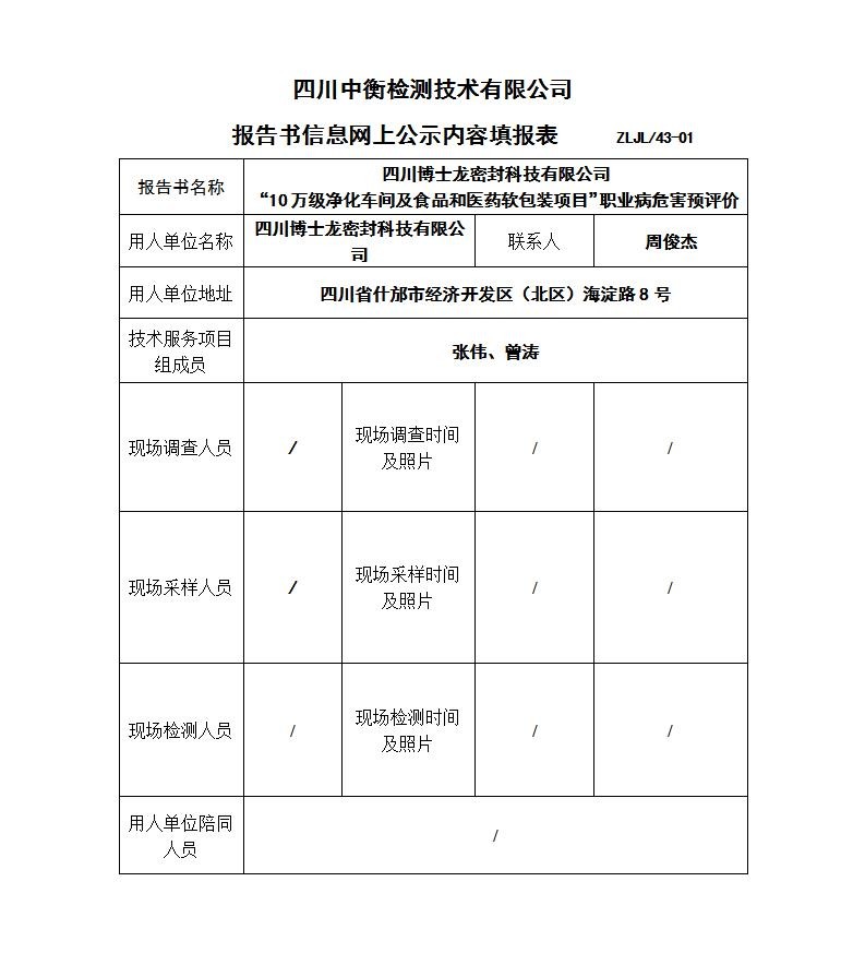 四川博士龍密封科技有限公司“10萬級凈化車間及食品和醫(yī)藥軟包裝項目” 職業(yè)病危害預評價