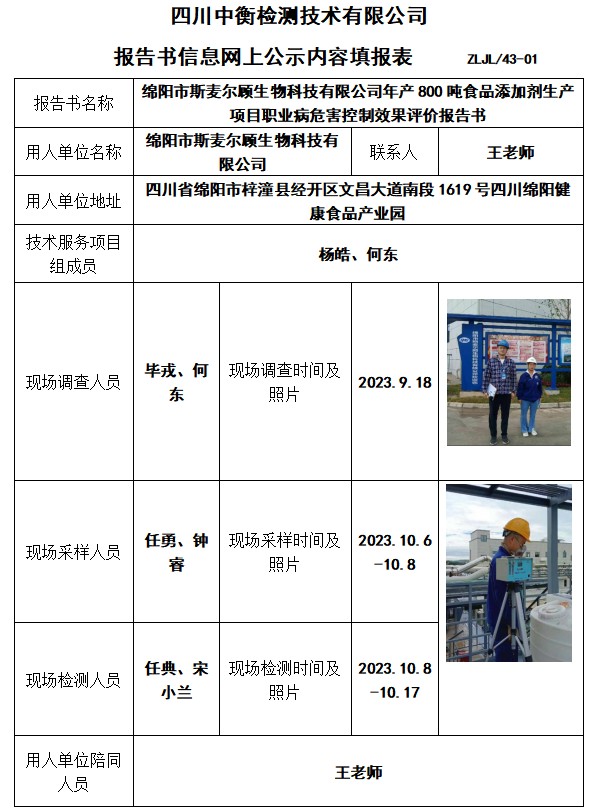 綿陽市斯麥爾顧生物科技有限公司年產(chǎn)800噸食品添加劑生產(chǎn)項目職業(yè)病危害控制效果評價報告書
