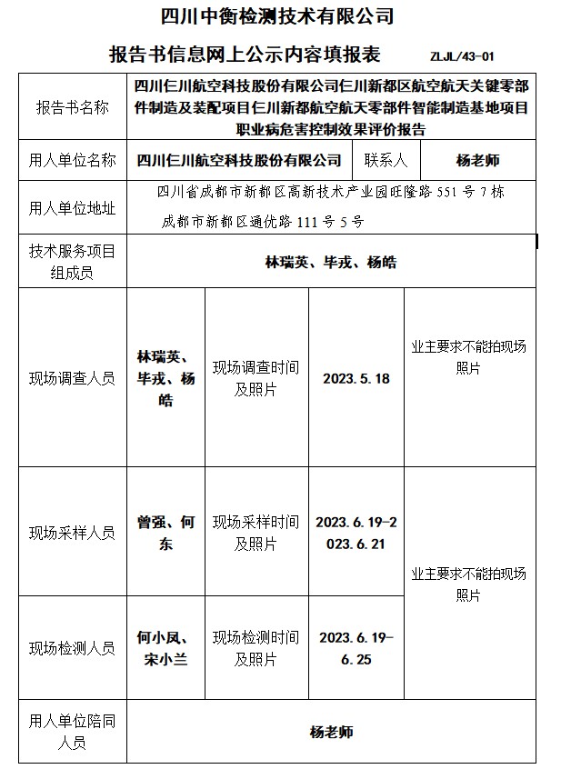 四川仨川航空科技股份有限公司仨川新都區(qū)航空航天關(guān)鍵零部件制造及裝配項(xiàng)目仨川新都航空航天零部件智能制造基地項(xiàng)目職業(yè)病危害控制效果評(píng)價(jià)報(bào)告