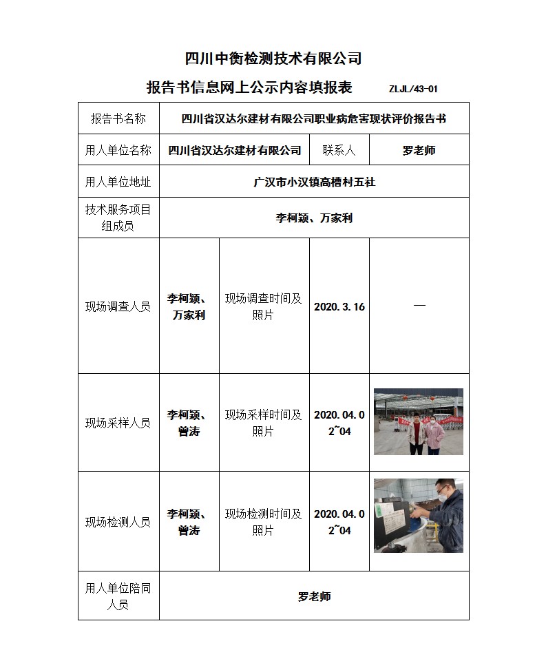四川省漢達(dá)爾建材有限公司 職業(yè)病危害現(xiàn)狀評(píng)價(jià)報(bào)告書