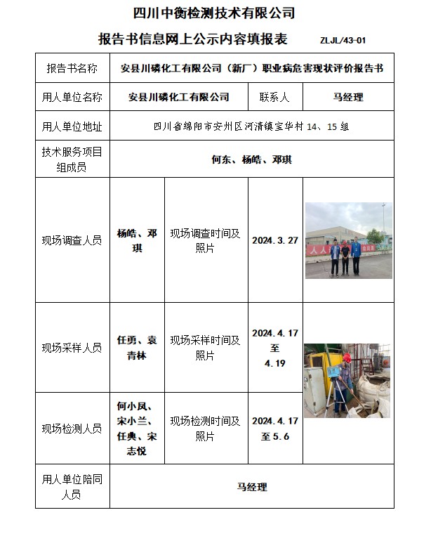 安縣川磷化工有限公司(新廠)職業(yè)病危害現(xiàn)狀評價報告書