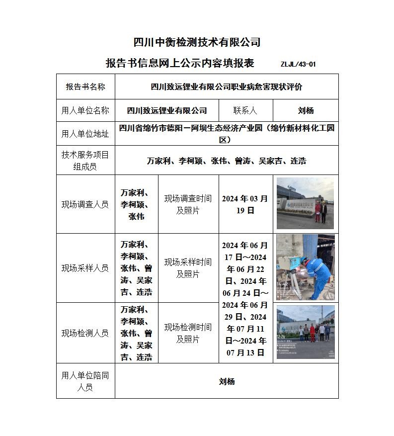四川致遠(yuǎn)鋰業(yè)有限公司職業(yè)病危害現(xiàn)狀評價