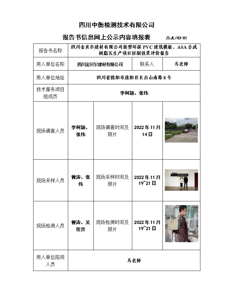 四川金貝爾建材有限公司 新型環(huán)保PVC建筑模板、ASA合成樹脂瓦生產(chǎn)項目 職業(yè)病危害控制效果評價報告書